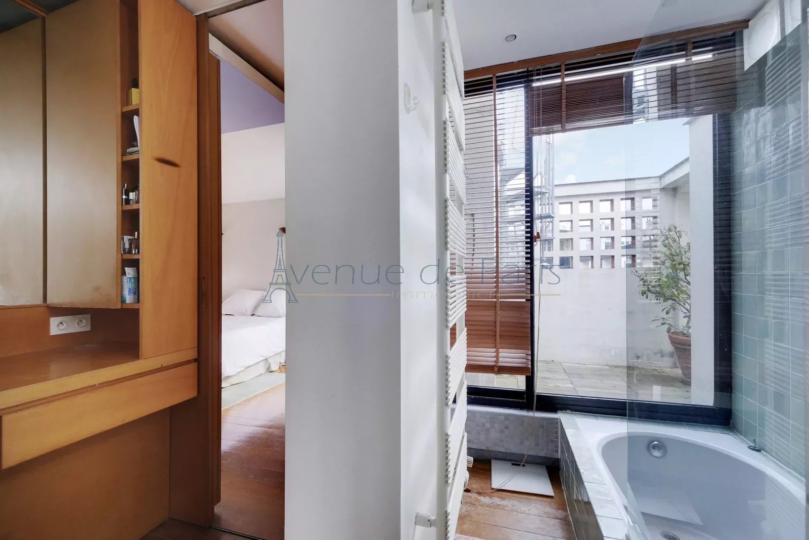 On the third floor, the master suite occupies the entire floor: bright bedroom, en-suite bathroom, small intimate terrace… and the famous spiral staircase leading to the roof terrace.